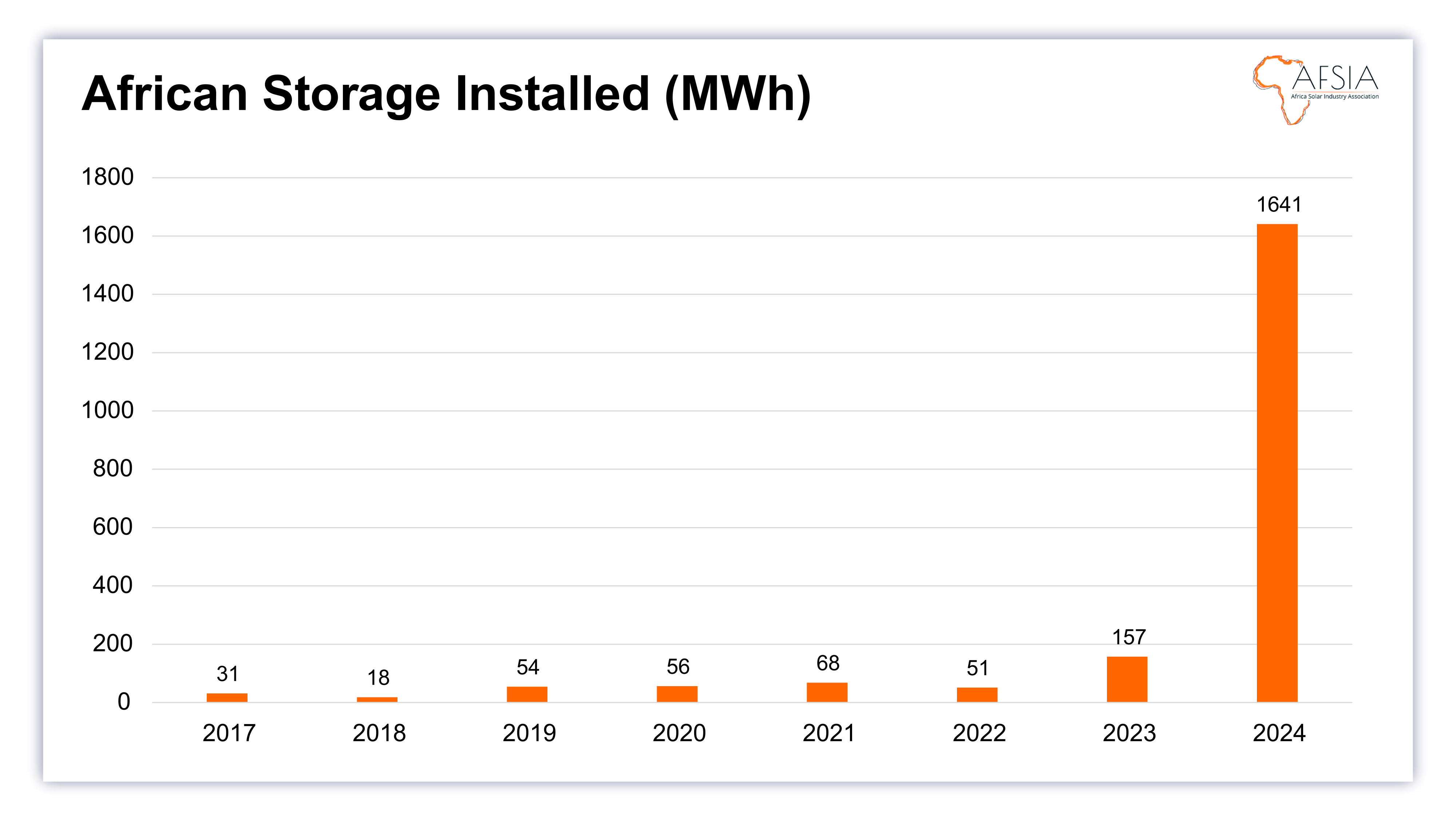 Storage solutions are experiencing a tremendous boost in Africa. The annual capacity recorded by AFSIA stalled at around 50 MWh (exclusive of SHS and residential systems). The use of storage tripled in 2023 and then experienced another 10-fold increase in 2024
