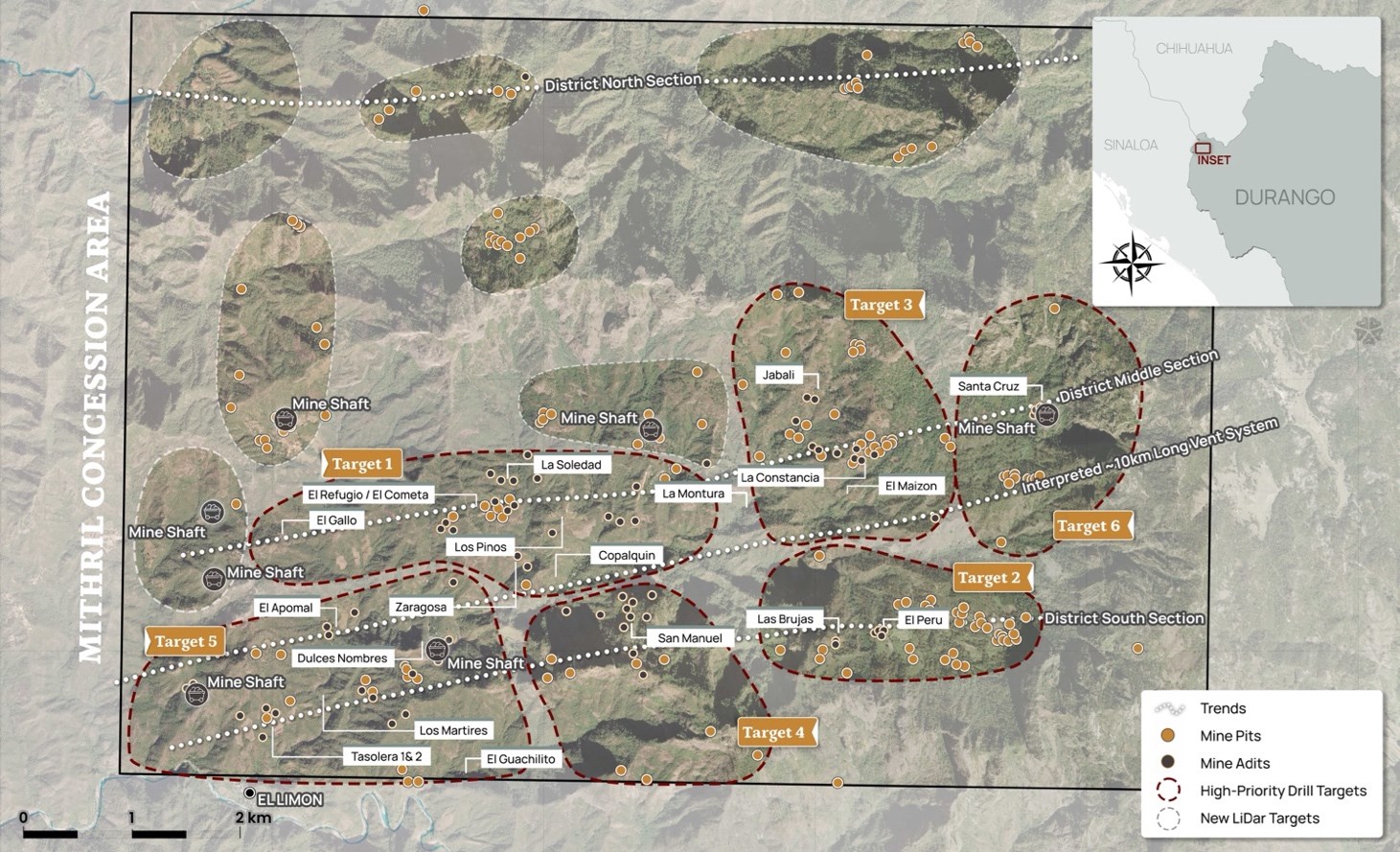 Figure 2 LiDAR identified historic workings across the 70km2 district. Current drilling locations at Target 1 west and Target 5 (El Apomal), and recent drilling at Zaragoza mine in Target 1 south, high priority drill target area of La Constancia-El Jabali (Target 3). Several new areas highlighted across the district for follow-up work including recently sampled Target 6