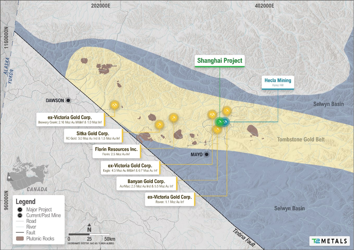 The Shanghai project sits in the Mayo Mining District (Figure 1), 12 km west of Hecla Mining’s Keno Hill silver mine with road access within 5km, and Banyan Gold’s AurMac camp only 6km away. Shanghai lies in the Tombstone Gold Belt within 10km of multiple resource-stage gold projects as reported within NI43-101 compliant technical reports since 2022 (see resource information pertaining to the Eagle, Olive, Raven, Airstrip and Powerline projects in Table 1 and www.sedarplus.ca for supporting technical reports).