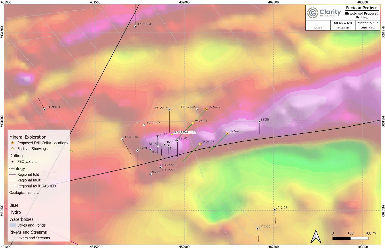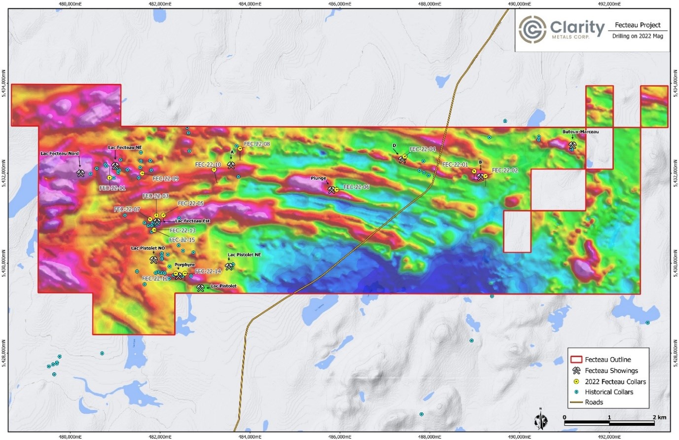 Inclusion of the 2022 field work into the Property’s dataset has been valuable in adding to the understanding of the Fecteau Property. Clarity’s previous drilling in 2022 included gold intercepts in hole FEC-22-05 and FEC-22-13 at the Fecteau East showing. A prominent structure was encountered in FEC-22-14 which intersected 0.80m of 1.08 g/t Au starting at 262.0m into the Porphyre showing. Drill holes in the VMS targets have successfully intercepted exhalative material containing disseminated to locally massive sulphides and returned anomalous Cu and Zn values in holes FEC-22-04 and FEC-22-09, but follow up drilling is required to continue to target potentially thicker portions of the same stratigraphic horizon.