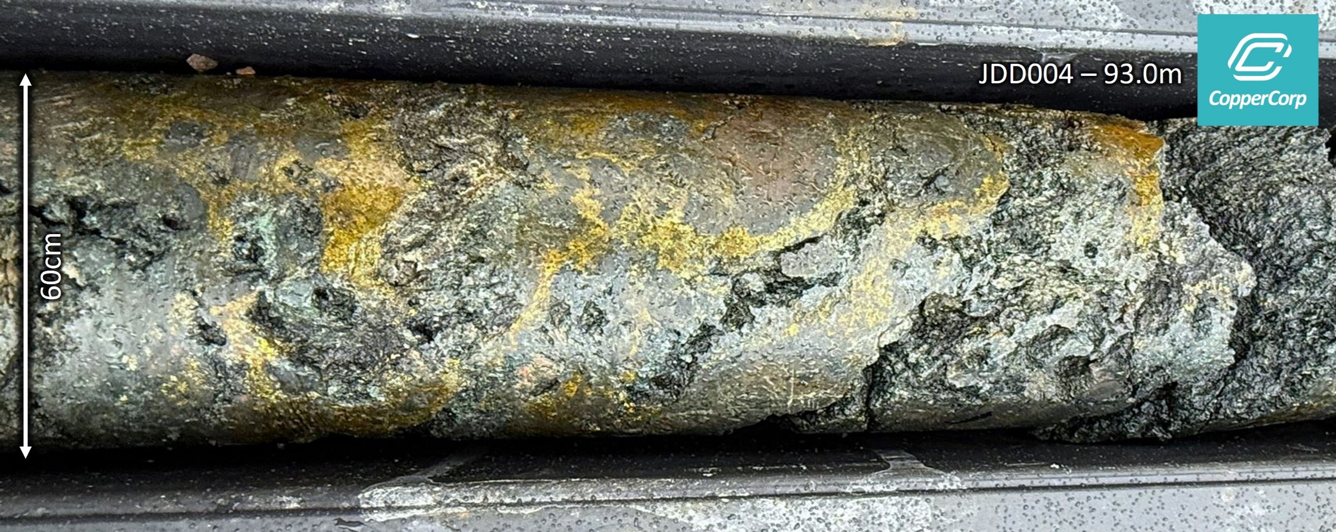 Example of core showing high-grade chalcopyrite-pyrite-chalcocite mineralization, JDD004, 93.0m (1.0m @ 6.95% Cu, 0.53g/t Au, 23.4g/t Ag (7.48% CuEq) from 92.6m).