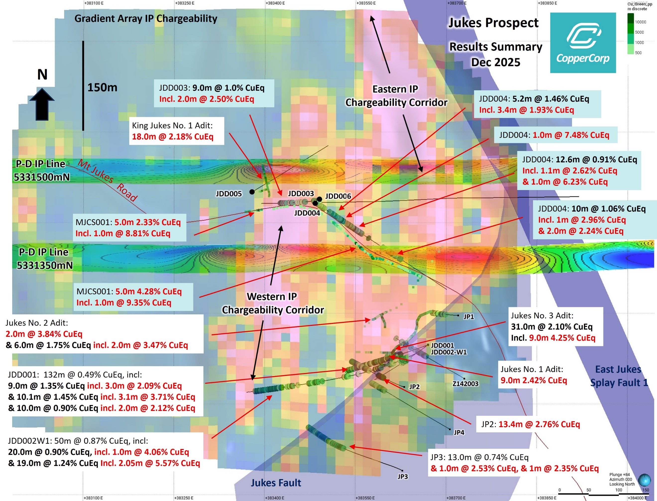 - Initial Phase 2 drilling results confirm the northern extension of high-grade Cu-Au-Ag mineralization at Jukes, with new drillholes intersecting mineralization approximately 300 m along strike from CopperCorp’s previous drilling. Key drill intercepts include: