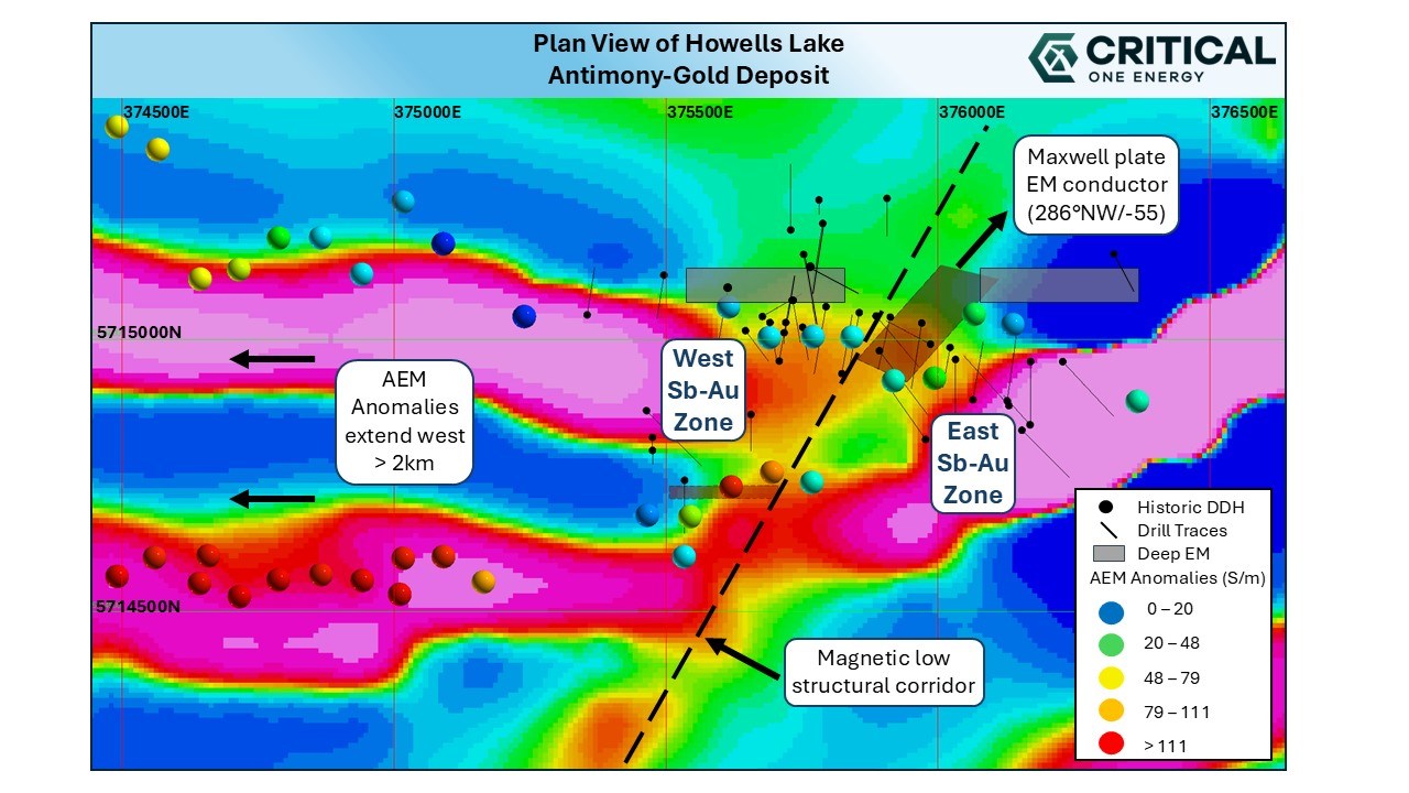 Toronto, Ontario–(Newsfile Corp. – December 2, 2025) – Critical One Energy Inc. (CSE: CRTL) (OTCQB: MMTLF) (FSE: 4EF0) (formerly Madison Metals Inc.) (“Critical One” or the “Company“), a leading Canadian mining exploration company focused on critical metals and minerals, is pleased to announce that advanced geophysical and geological modelling of a recently completed VTEM airborne magnetic and electromagnetic (EM) geophysical survey has identified significant potential expansions to the mineralization at its Howells Lake Antimony-Gold Project (“Howells Lake Project”). The new interpretive results confirm the potential for discovering additional areas of mineralization containing both antimony and gold along highly altered and sulphide-bearing stratigraphic contacts that extend laterally westward for at least two kilometres (km). Modelled EM conductors also reside at depth below historic drilling and along strike of a magnetic low structural corridor. The new interpretive work indicates that the favourable stratigraphy is steeply dipping and extends to a depth of more than 300 metres (m). The Howells Lake Project is located approximately 120 km west of the Ring of Fire road corridor in the Thunder Bay North Mining Division of Ontario, Canada.