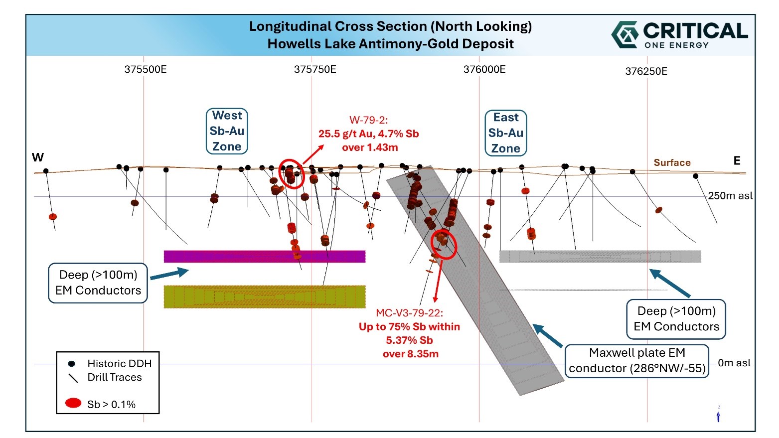 Figure 2: North-looking cross section of Howells Lake antimony-gold zones. Modelled EM conductors show potential for lateral extension of mineralized zones below historic drilling.