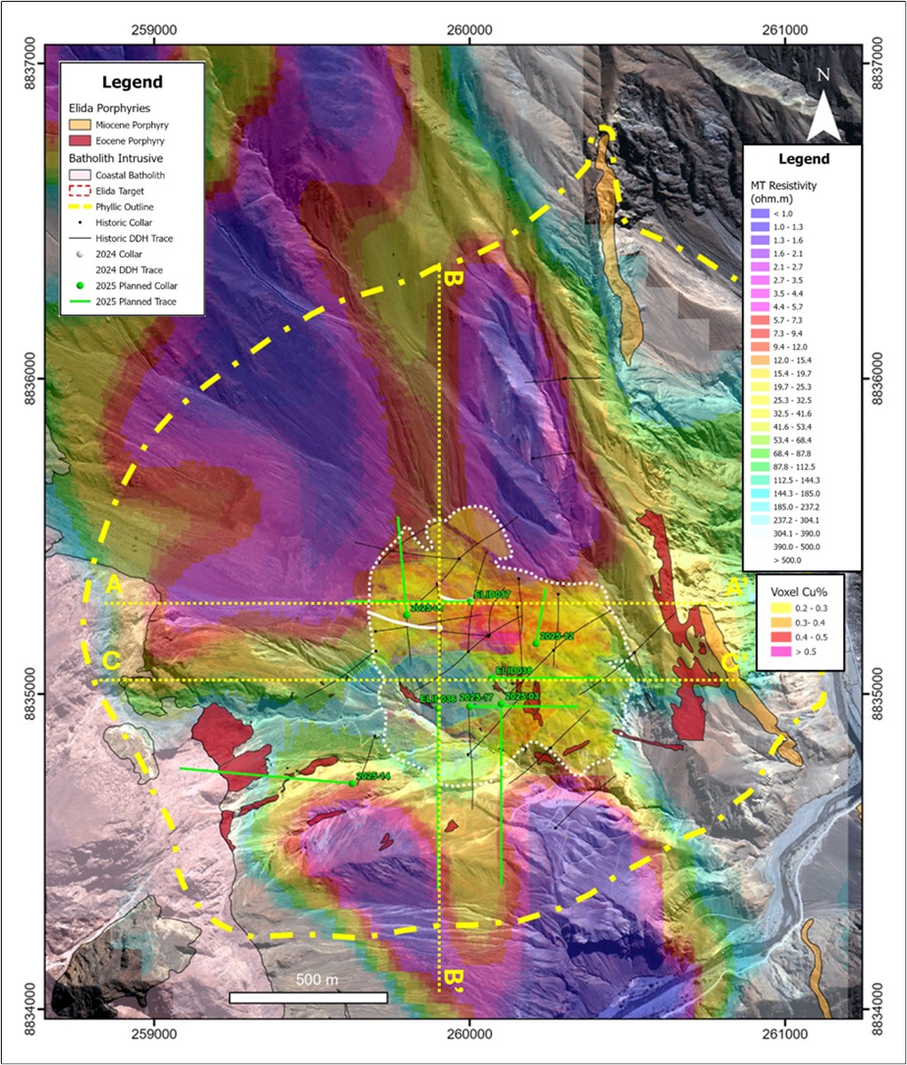 Figure 1: Location map showing the planned 2025 diamond drilling program at Elida. The proposed drill holes are highlighted in green superimposed on the surface projection of the Mineral Resource (outlined in white) and a 2D level slice of the 3D MT resistivity model at -400 m below topographic surface. The map also shows the location of the porphyry intrusions and the surface projections of historical drill holes. The locations of the 2D sections A-A’ in Figure 2, B-B’ in Figures 3 and C-C’ in Figure 4 are also shown.