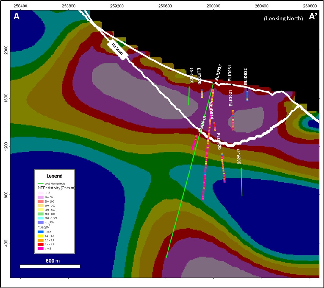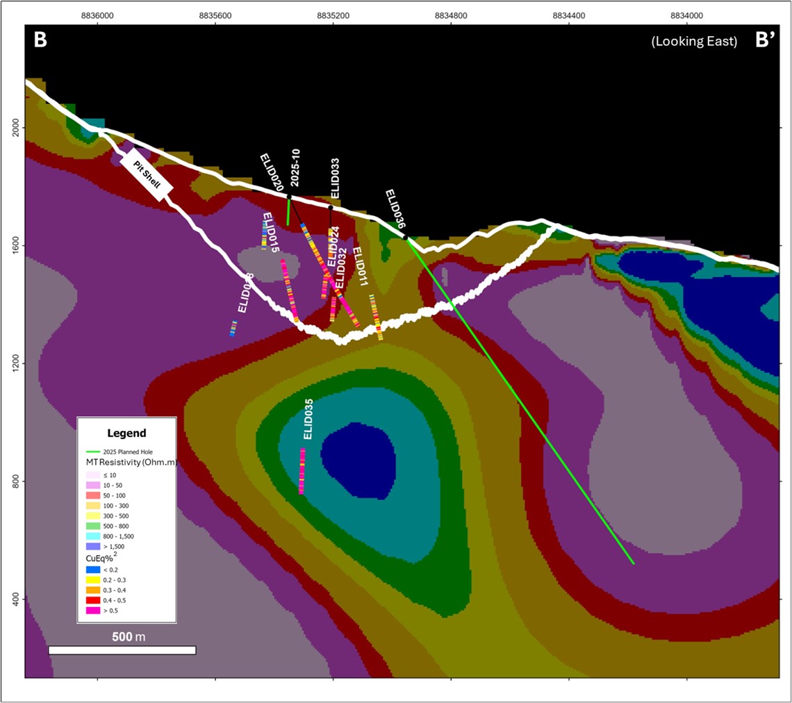 Hole ELID037 is designed to further define the Cu-Mo-Ag grade distribution within the existing Mineral Resource and to evaluate the potential for resource expansion beyond the current pit shell. The hole is planned to a depth of approximately 1,500 m to test for potential higher-grade mineralization below hole ELID033 while also testing a large, low-resistivity MT geophysical anomaly (Figure 2), interpreted to coincide with a potential higher-grade Cu-core.