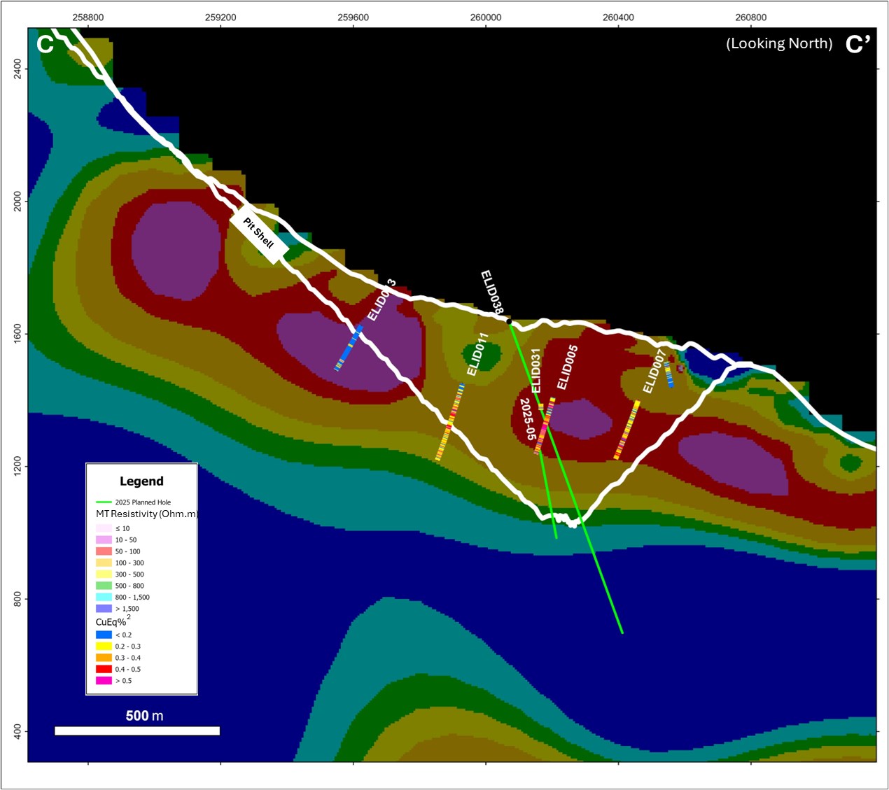 Figure 4: A 2D section (looking north) along proposed drill hole ELID038 plotted over the 3D MT resistivity model, drill hole traces from previous programs showing CuEq2 (%) grades, and the outline of the pit-shell. The location of this section (C-C’) is provided in Figure 1.