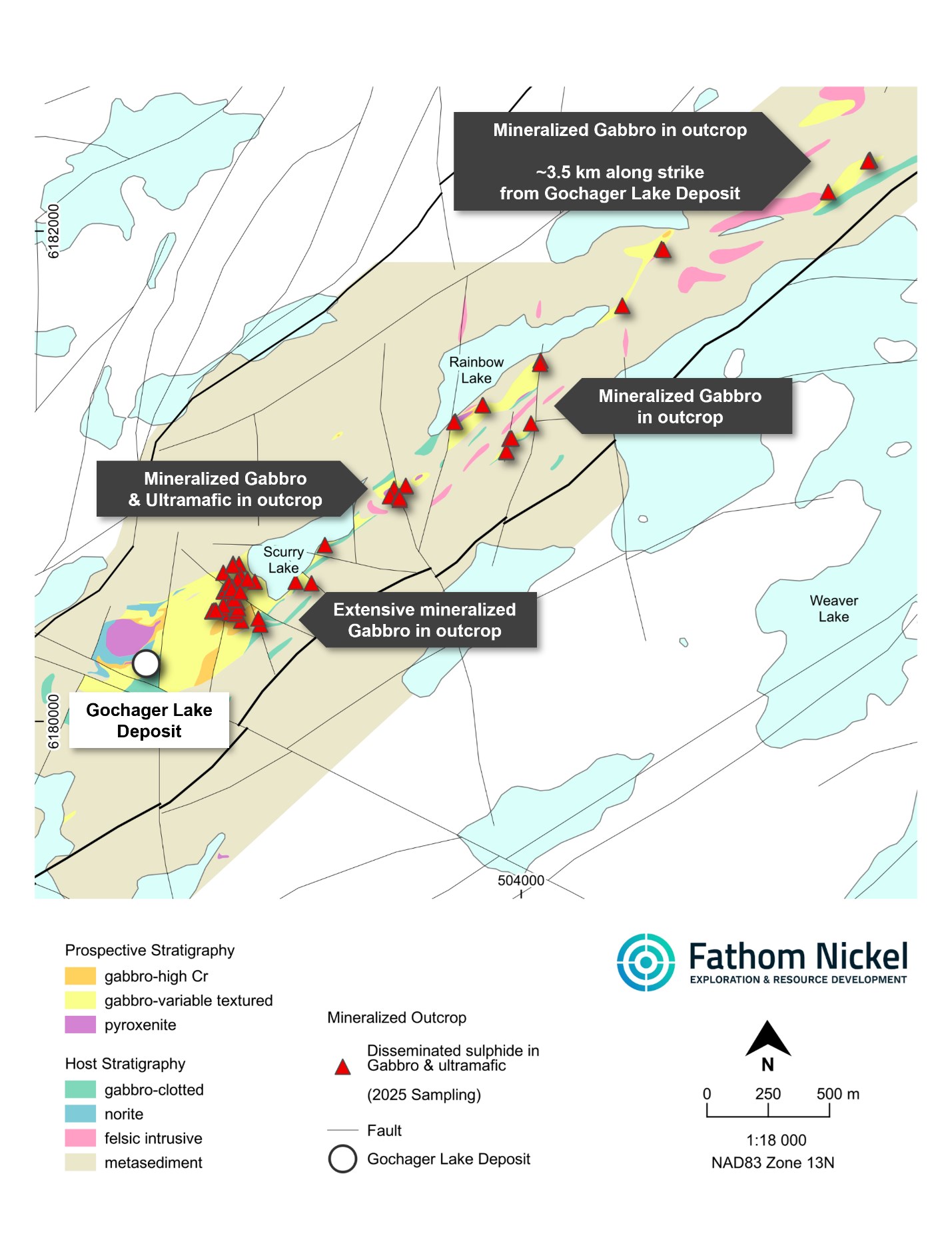 Calgary, Alberta–(Newsfile Corp. – October 23, 2025) – Fathom Nickel Inc. (CSE: FNI) (FSE: 6Q5) (OTCQB: FNICF) (“Fathom”, or the “Company“) is pleased to announce an updated geology map reflecting the most recent prospecting and pXRF (Portable X-ray Florescence) rock geochemistry results at the Gochager Lake project. The historic Gochager Lake deposit host rock (the “container rock“), has now been mapped consistently along strike northeast of the historic Gochager Lake deposit for a minimum distance of 3.5 kilometers. The Company is in receipt of all assays from the July 2025 program and awaits rock assay and whole rock geochemistry results from the September-October prospecting. These results are expected mid-November.