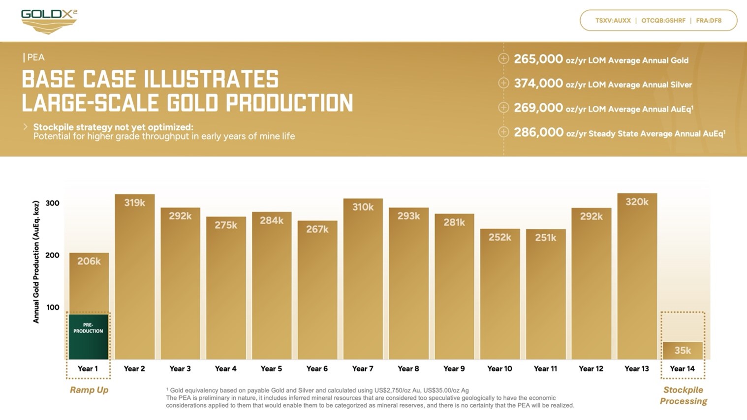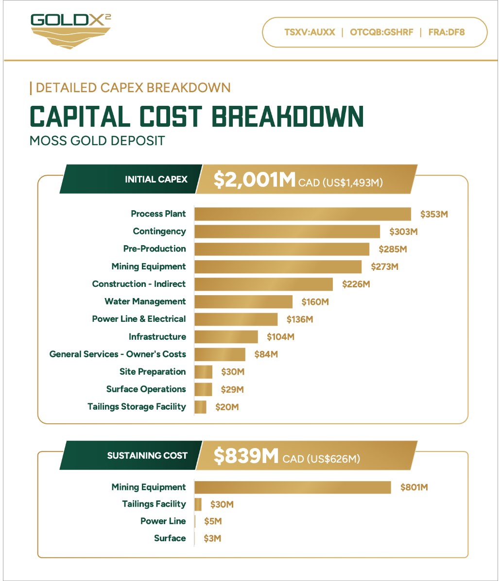 Michael Henrichsen, CEO of Gold X2, commented: “The Moss deposit MRE and PEA represents a major milestone for the Company as we have clearly demonstrated the potential for the Moss Deposit to be a top ten gold producer in Canada1,2. The Project benefits from exceptional infrastructure with the Trans-Canada highway and high-voltage powerlines within 12 kms of the proposed mine site. The PEA has outlined robust economics at a gold price of US$2,750, representing a base case scenario that the Company believes can be improved through potential resource expansion immediately adjacent to the design pit, enhanced metallurgical recoveries, and optimization of the mine schedule.