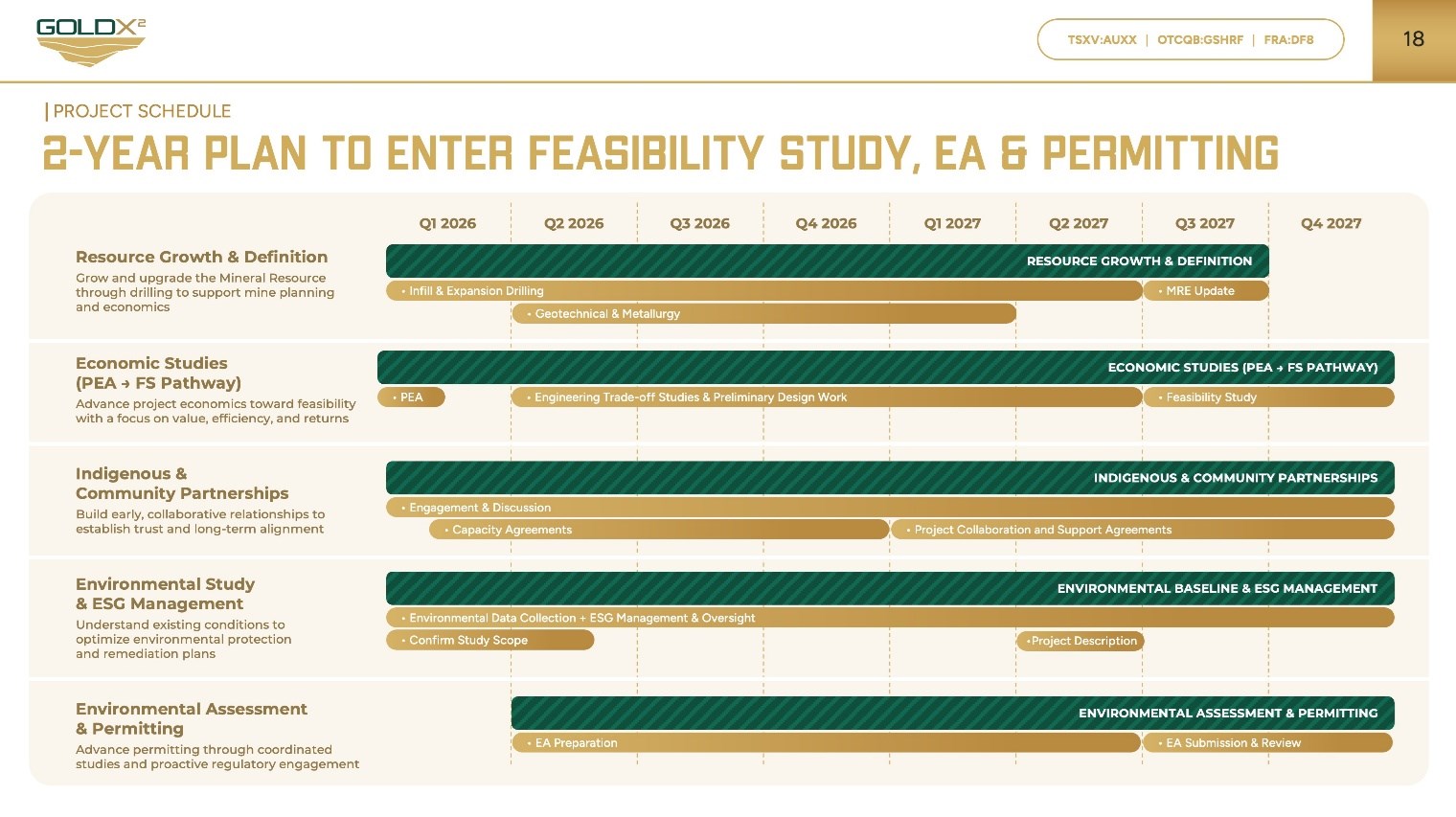 Gold X2 has, through CSL Environmental & Geotechnical, conducted existing conditions environmental studies since mid-2021. In parallel, with the support of One-Eighty Consulting Group, Gold X2 has carried out early engagement with potentially affected Indigenous Nations. Since the start of 2025, this work has expanded in scope and scale and will support future engineering studies and collaborative efforts to manage potential environmental effects.
