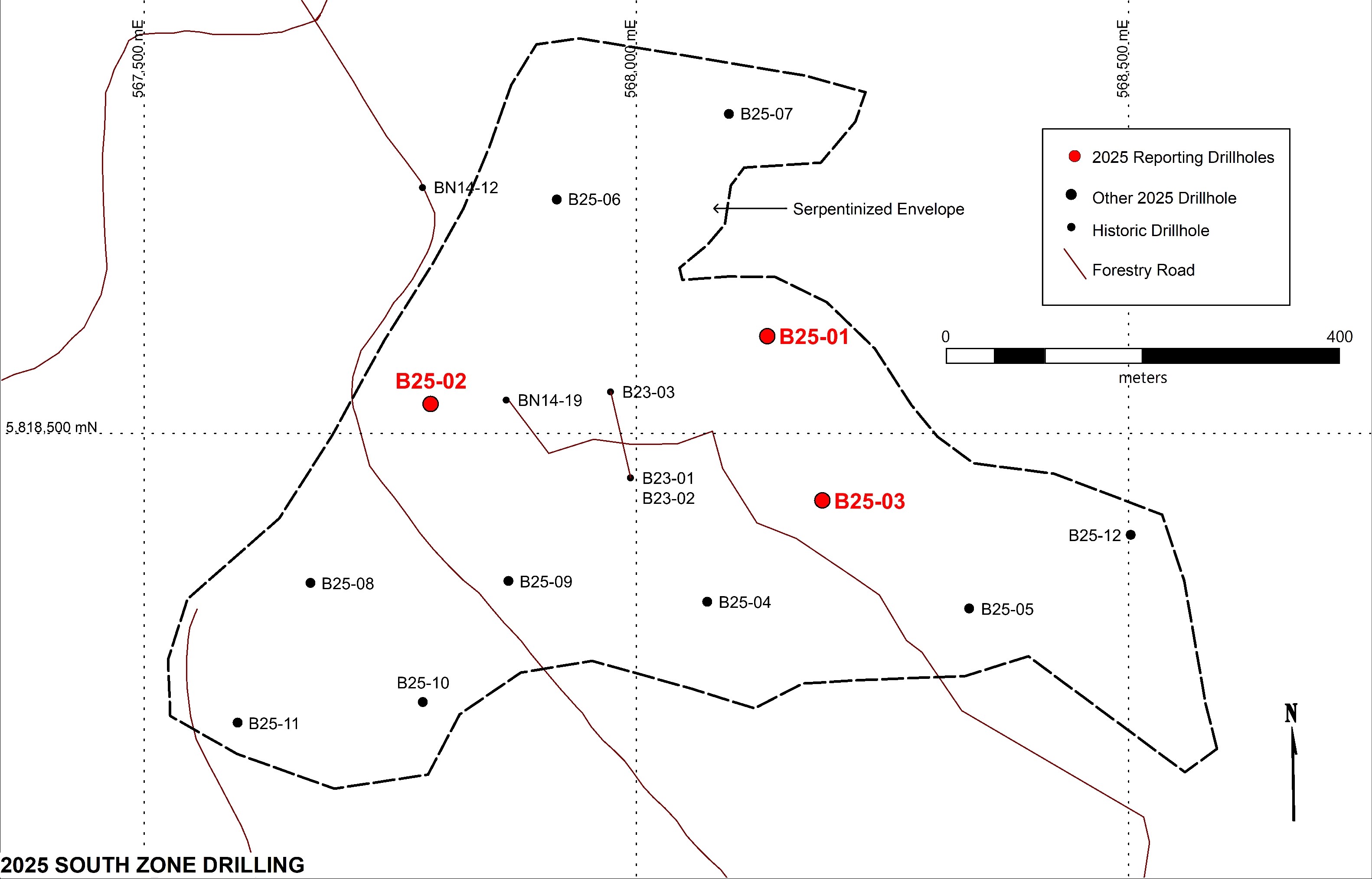 Vancouver, British Columbia–(Newsfile Corp. – November 26, 2025) – Inomin Mines Inc. (TSXV: MINE) (“Inomin” or the “Company“) is pleased to announce diamond drill results from the first three holes drilled at the South zone of the Beaver-Lynx project in south-central, British Columbia (the “Project”). Drill hole B25-01 (Az 0, Dip -80°) intersected 161.5 metres (m) grading, 0.19% nickel, 0.011% cobalt, 0.36% chromium, and 22.7% magnesium starting at bedrock surface located 30 metres from surface. Drill hole B25-02 (Az 0, Dip -80°) intersected 123 metres grading 0.19% nickel, 0.011% cobalt, 0.42% chromium, and 23.9% magnesium, and drill hole B25-03 (Az 0, Dip -80°) intersected 148 metres grading, 0.20% nickel, 0.012% cobalt, 0.38% chromium, and 21.4% magnesium. The first three drill holes – located approximately 200 metres from drilling completed in 2023 – confirms continuity of mineralization over substantial thickness and area.