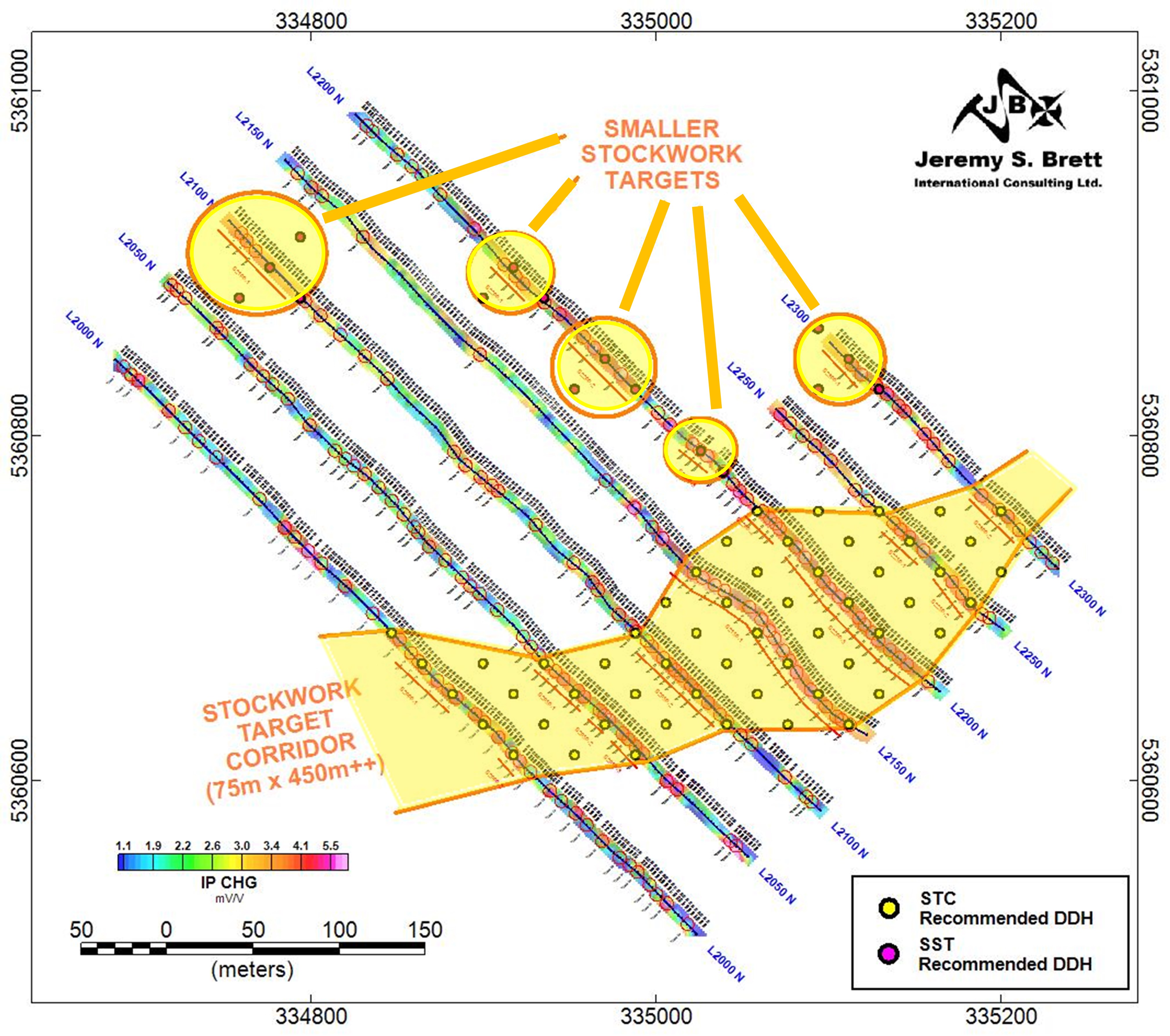 IP Survey Lines, Gridded Chargeability & Planned Drill Holes
