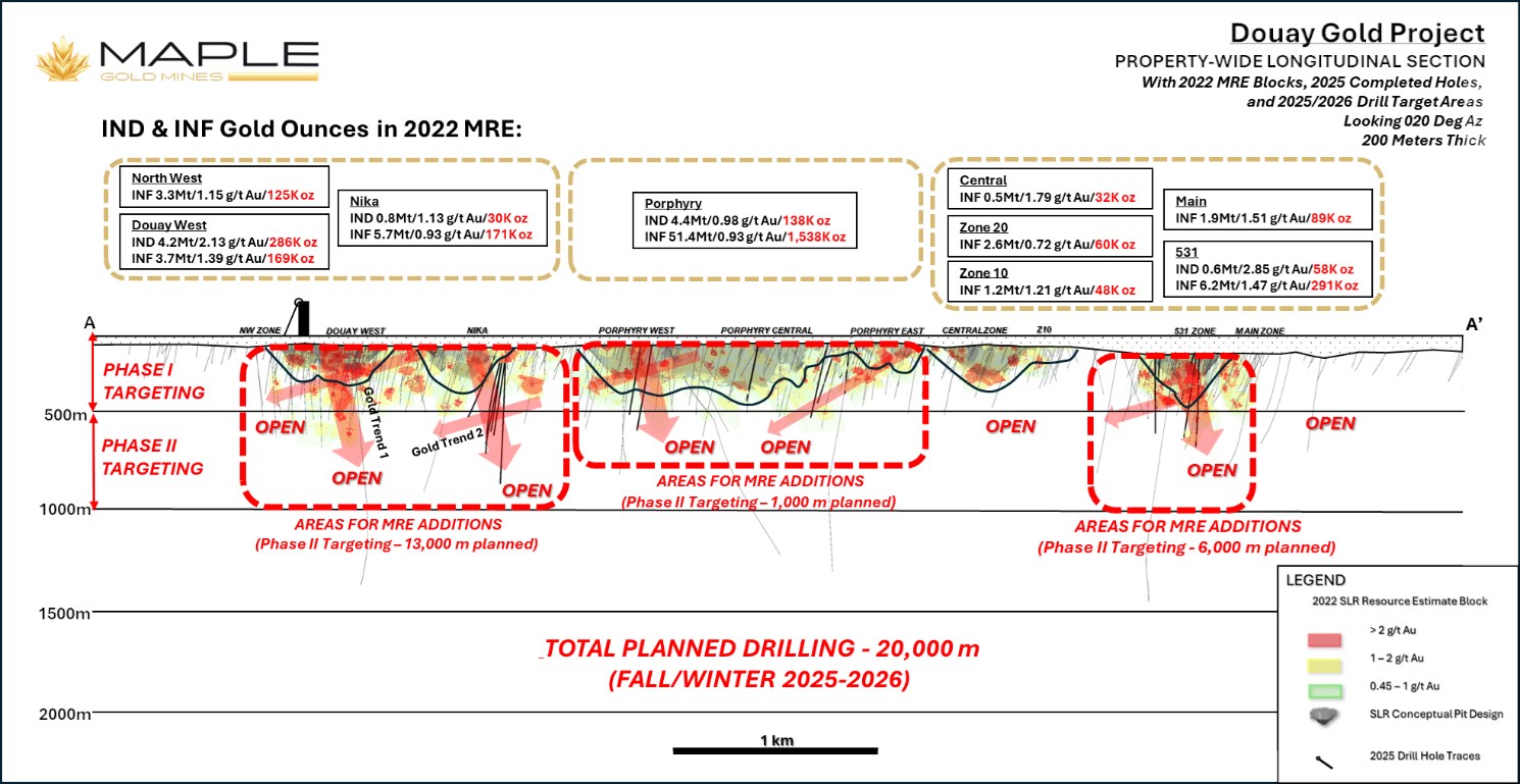 This $10 million Program, utilizing four drill rigs, represents the largest expansionary drill campaign in the Property’s history and builds on the successful 12,240 m Phase I Douay program completed in H1 2025. With a strong cash position of approximately $20.5 million, Maple Gold is well positioned to advance the exceptional district-scale gold potential at Douay/Joutel.