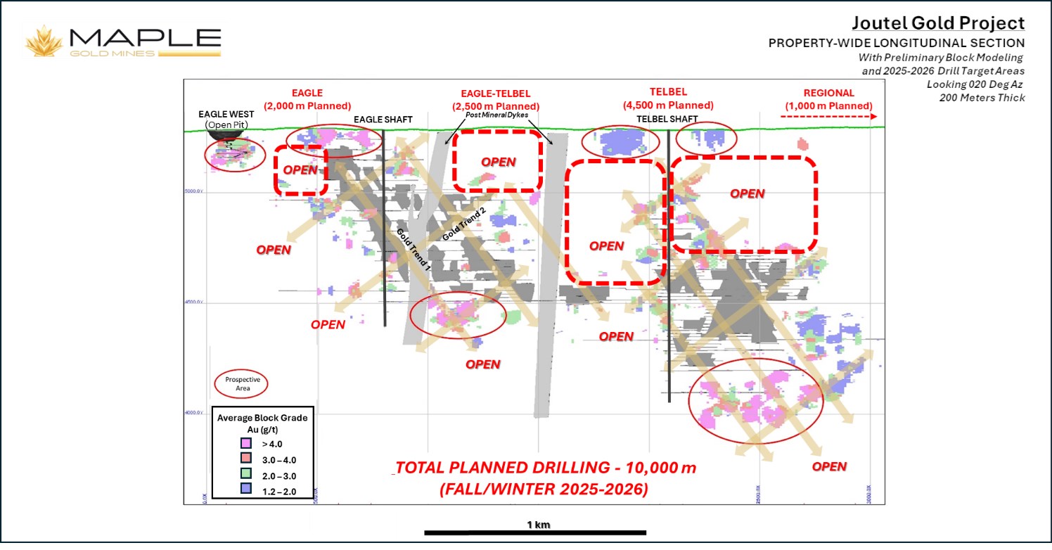 Figure 3. Joutel longitudinal section highlighting the past-producing, high-grade Eagle West, Eagle, and Telbel mines, updated preliminary block model, and planned Fall/Winter 2025-2025 drill targets.