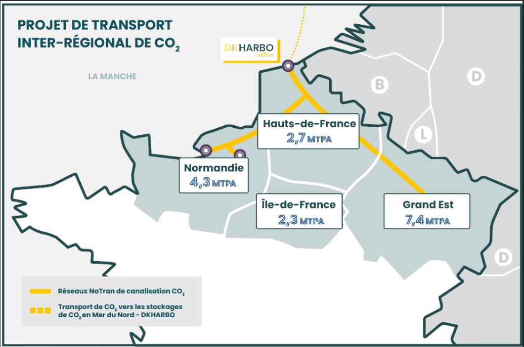The project led by NaTran involves a CO2 transport backbone spanning approximately 1,000 kilometers across four French regions (Grand Est, Hauts-de-France, Normandy, and Île-de-France), connecting carbon capture and utilization projects, particularly in major industrial areas such as the Seine Valley and the Port of Dunkirk.