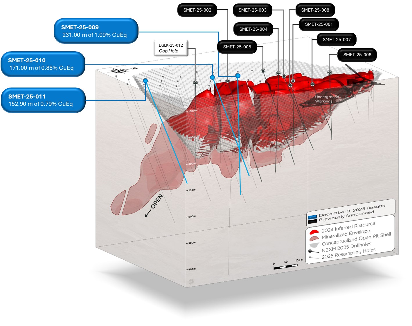 All mineralization from SMET-25-011 was intercepted below the Mineral Resource Estimate (“MRE”) and the conceptual pit demonstrating the potential for expansion of the deposit at depth.