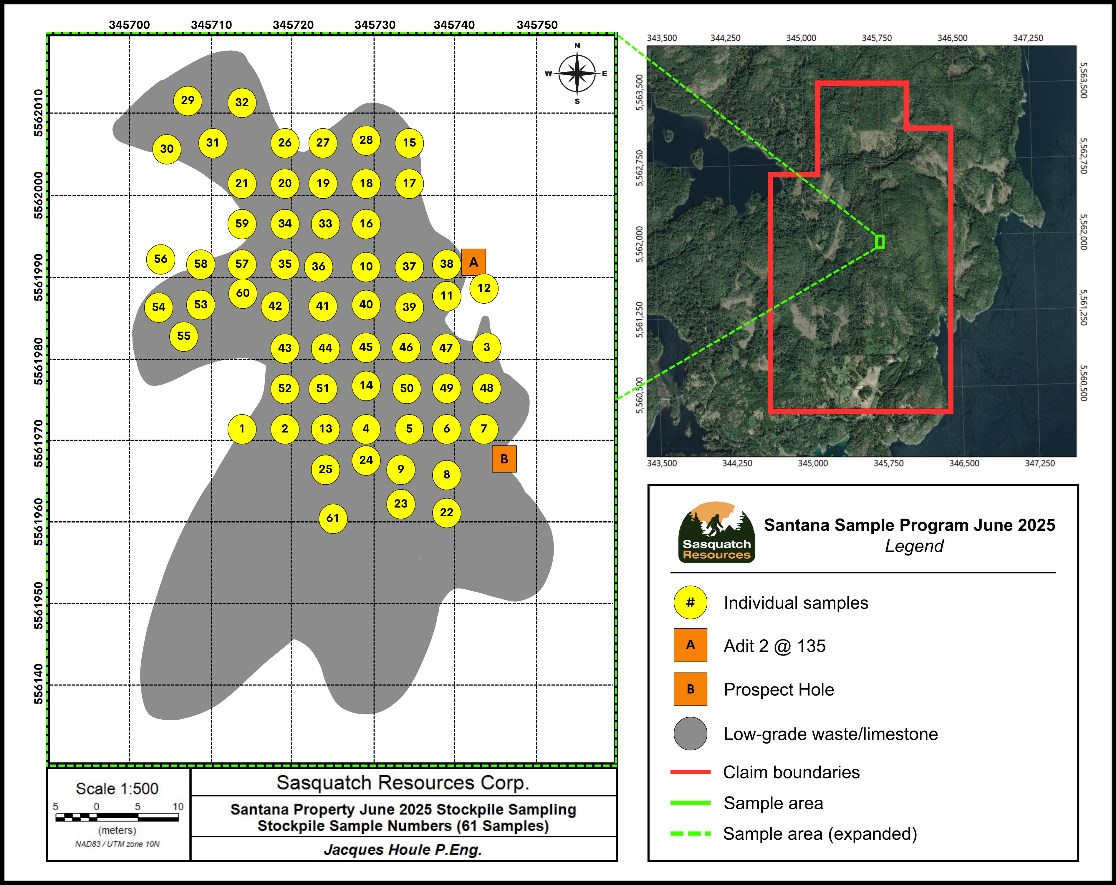 Sasquatch is also pleased to announce the results of its recently completed grid sampling program at its Santana property (“Santana“), encompassing the area known as the former Santana mine and covering 517.19 hectares located on Quadra Island, British Columbia.