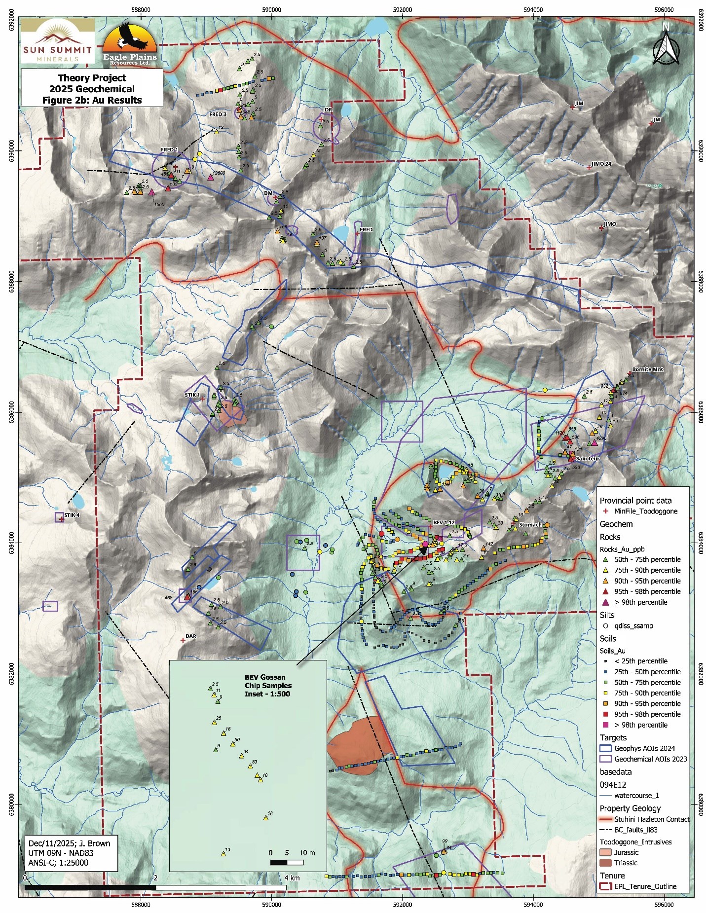 “We are pleased to announce very exciting results from the 2025 Theory exploration program,” said Niel Marotta, CEO of Sun Summit Minerals. “The work confirms the strong high-grade copper-gold potential at several of the known zones, and also at the newly defined Saboteur Zone, which likely hasn’t seen boots on the ground in more than 30 years. Mapping and sampling at the BEV zone has established significant scale potential which remains open in all directions across the corridor. More fieldwork is warranted in the 2026 exploration season to define future drill targets, and we look forward to continuing to work with Eagle Plains and Terralogic as we advance the Theory Project towards its first-ever inaugural drill campaign.”