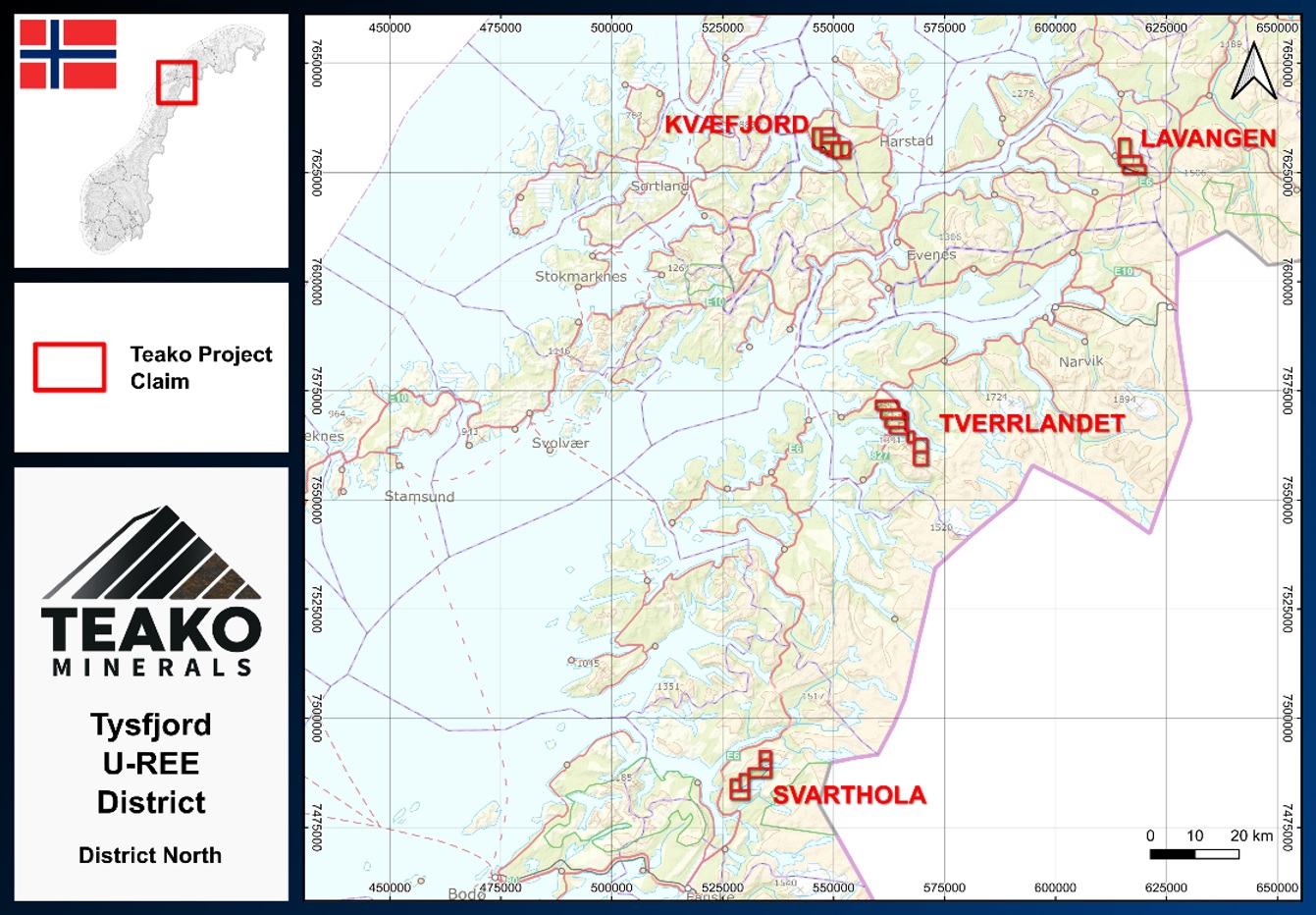 At the Tverrlandet Project, which is situated approximately 45 km southwest of Narvik, the focus was to assess the rare earth elements (“REE”) and U potential of the northern Tysfjord basement window, within the TIB-2 granites. Historical soil geochemistry data collected by the Norwegian Geological Survey (the “NGU”) identified local soil anomalies reading up to 19.2 ppm U2, recorded around the area the Teako field crew focussed its exploration efforts.