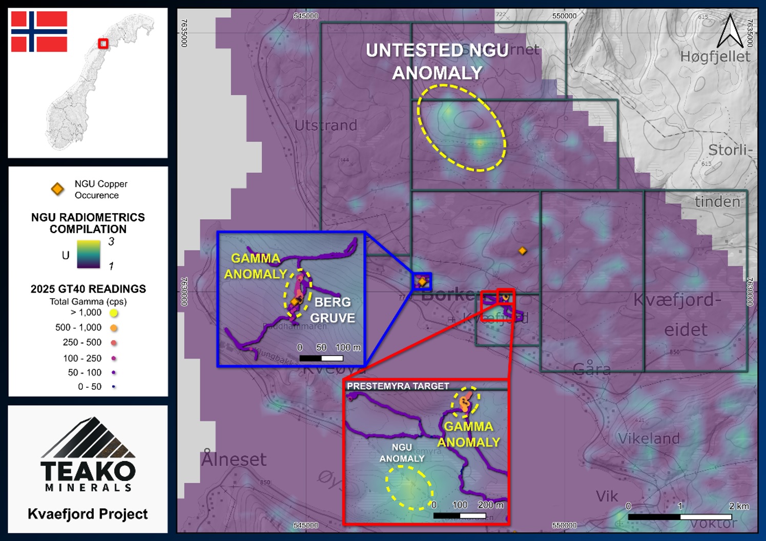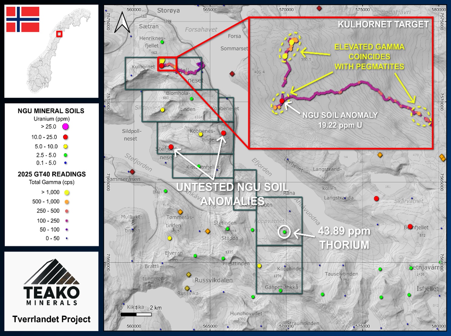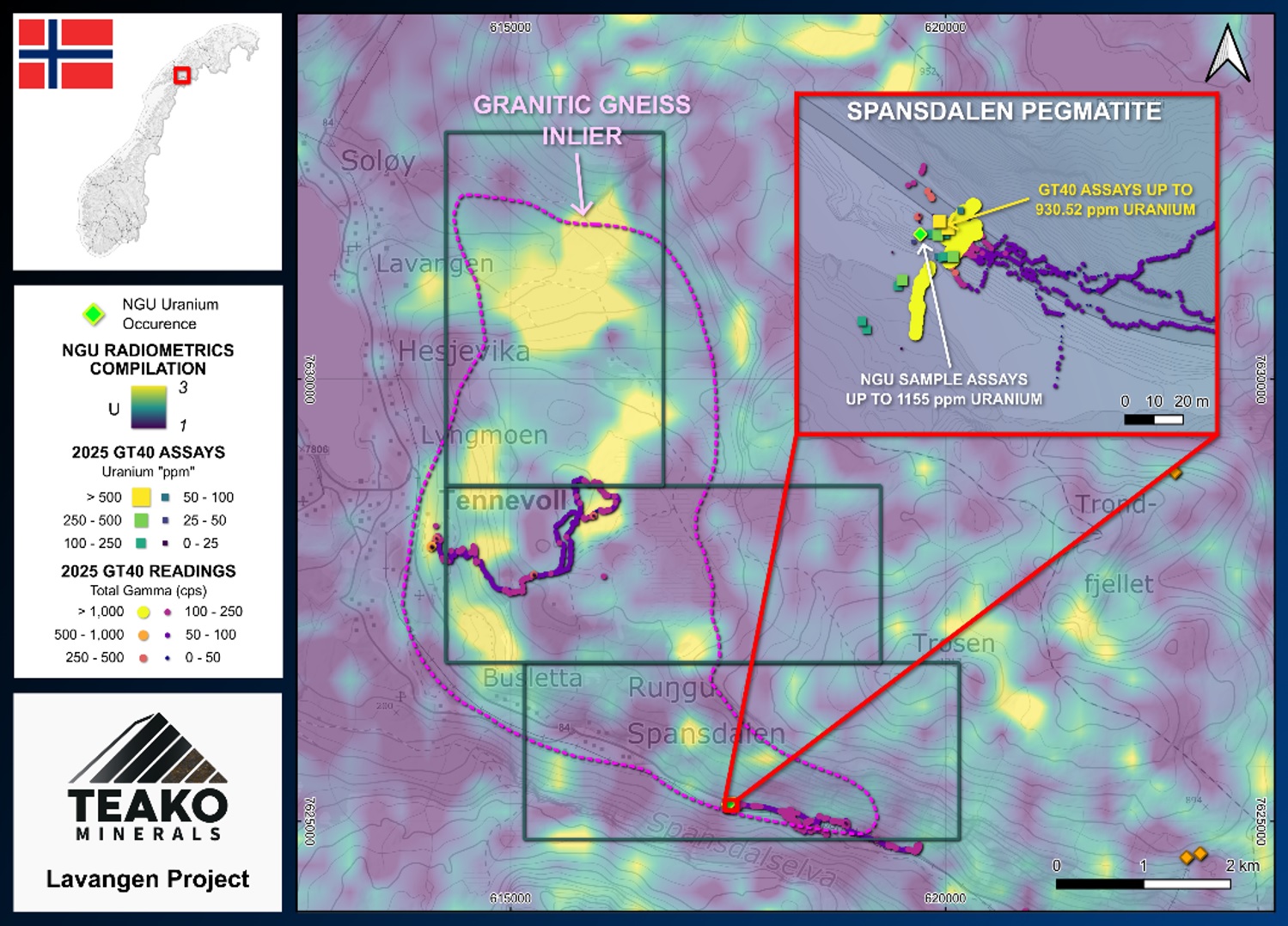 Vancouver, British Columbia–(Newsfile Corp. – November 27, 2025) – Teako Minerals Corp. (CSE: TMIN) (the “Company” or “Teako“) is pleased to announce the successful completion of its 2025 field program on four (4) 100%-owned uranium (“U”) projects in northern Norway (the “Projects”). The field mapping/sampling program has confirmed the prospectivity of these Projects for uranium deposits associated with felsic intrusions / pegmatites, and was complemented by a ground gamma-ray spectrometry survey which returned elevated U concentrations (up to 7,114 ppm1) at the Svarthola project.