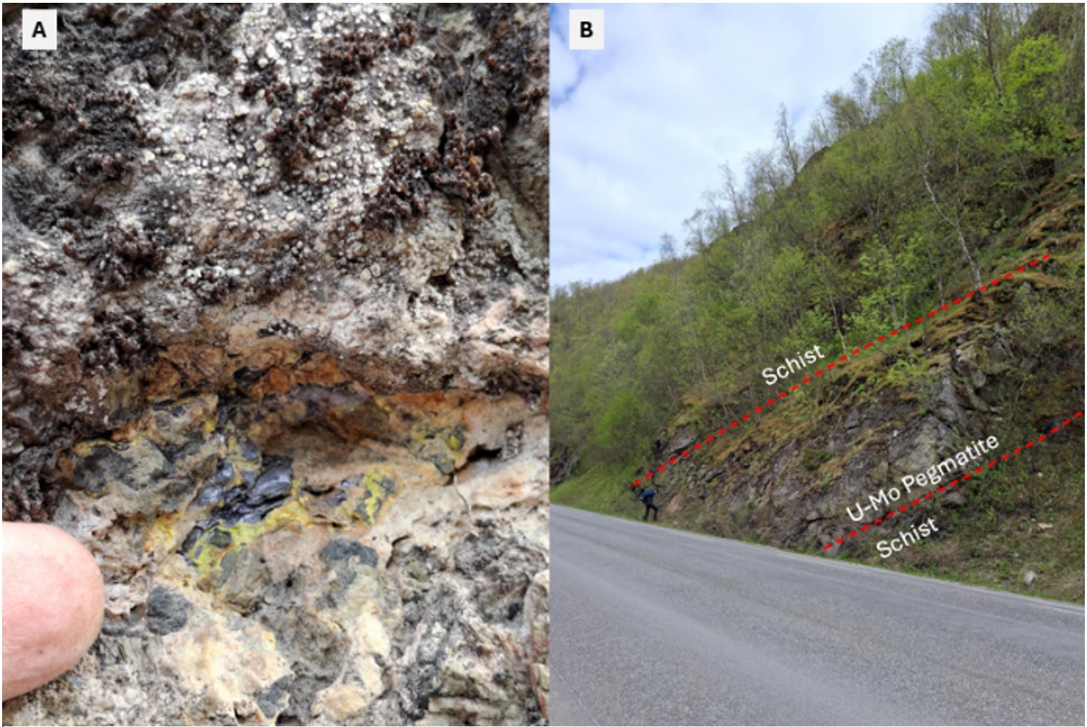 Figure 5: Outcropping molybdenite and secondary uranium mineralization within the Spansdalen pegmatite