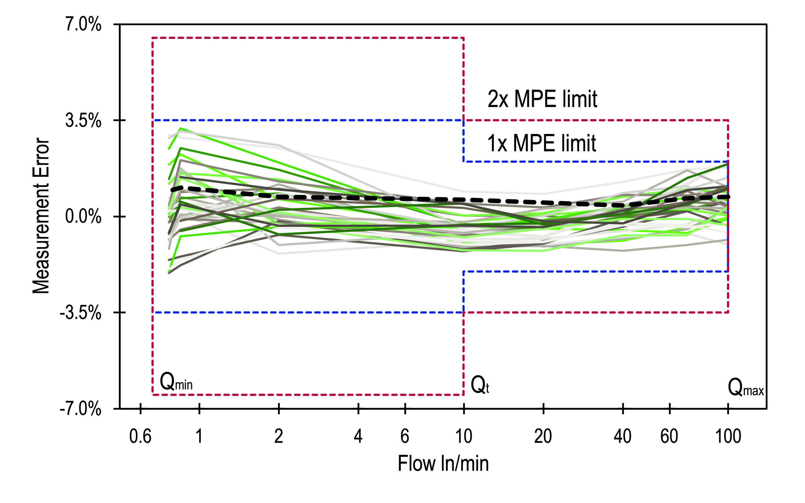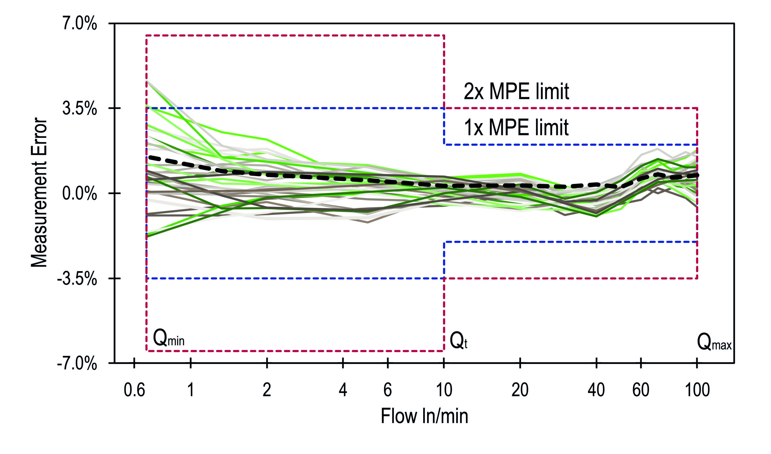 Various national and international standards regulate the required accuracy of gas meters. Different accuracy classes exist, with class 1.5 being the most widely used worldwide. OIML R137 and EN 17526 (the dedicated thermal-mass gas metering standard being published in 2021) define the maximum permissible error (MPE) for temperature-compensated class 1.5 gas meters (such as thermal-mass meters) as 2% and 3.5% at high and low flow regimes, respectively. OIML R137 additionally prescribes 2x MPE (3.5% / 6.5%) for meters that have been re-measured following in-field service. Hence, the 2x MPE is widely accepted as the bar that a meter has to clear while in service (typically 10–15 years).