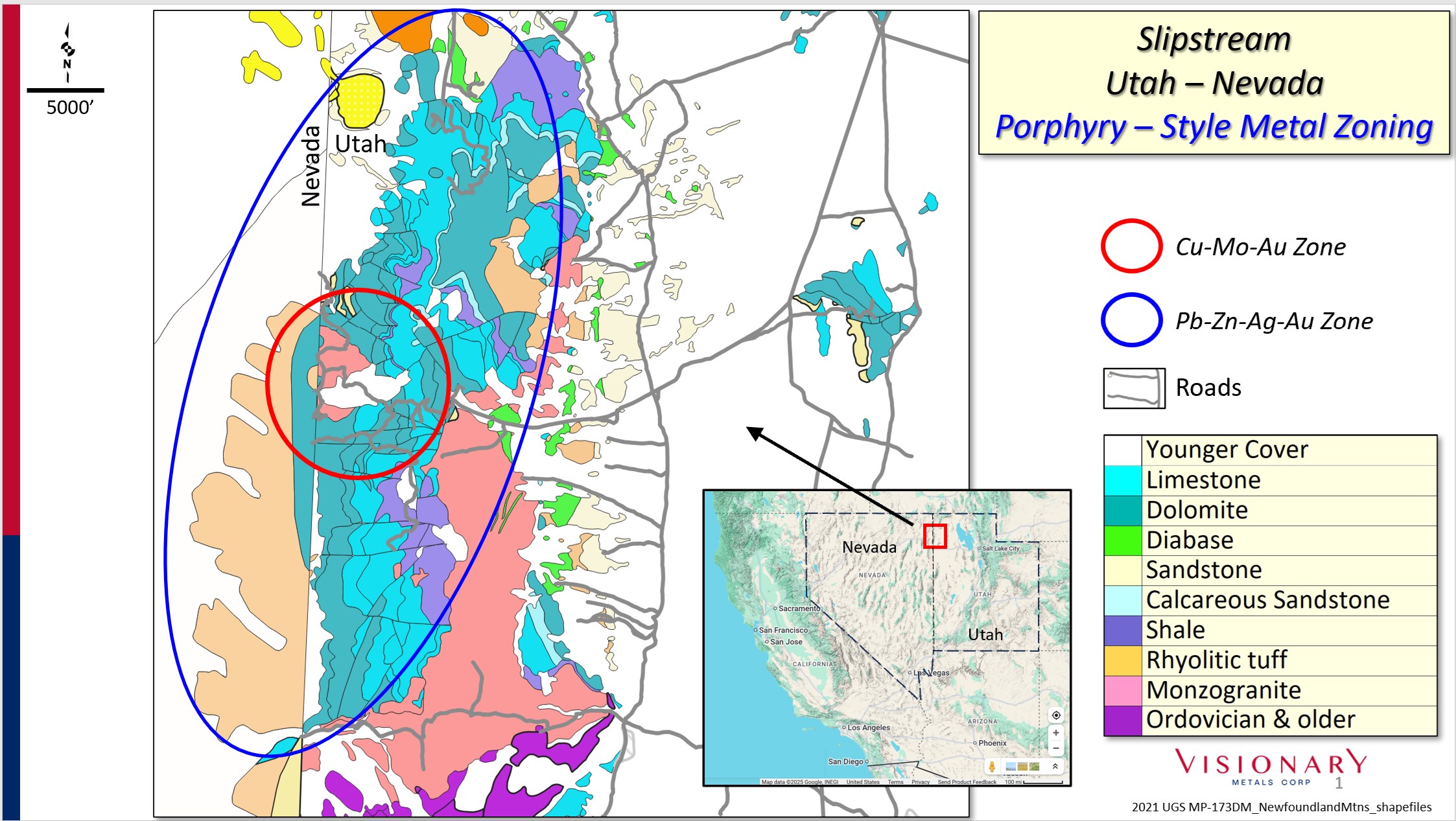 “The Slipstream project exhibits classic geochemical and geologic characteristics of a porphyry copper-gold system with mineralized peripheral skarn and CRD components intact and visible at surface within the 5km by 10km alteration halo,” commented Wes Adams, CEO of Visionary Metals. “Modern, low-impact geophysical exploration tools paired with conventional mapping, sampling and petrographic analysis will help Visionary define drill targets for porphyry copper, gold and silver mineralization within the large hydrothermal system. Excellent infrastructure, including Interstate 80, Union Pacific railway, power, year-round access and proximity to copper smelting capacity, combined with strong community and state support for mining in both Utah and Nevada makes Slipstream an exciting new discovery opportunity.”