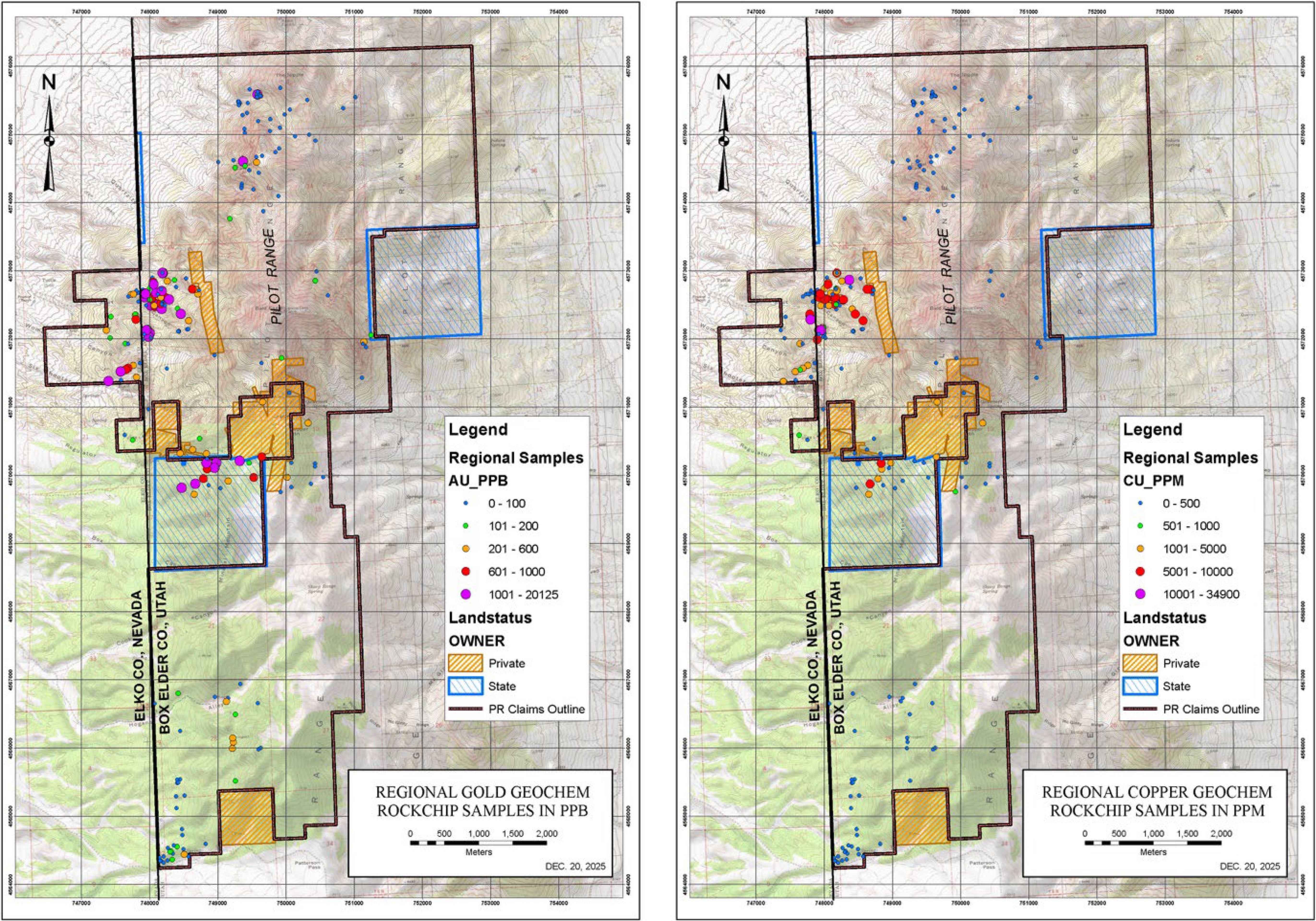 Figure 1. Select Regional Gold (left) and Copper (right) Geochemical Rock Chip Sampling Results